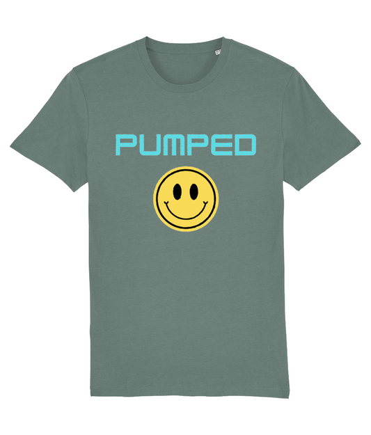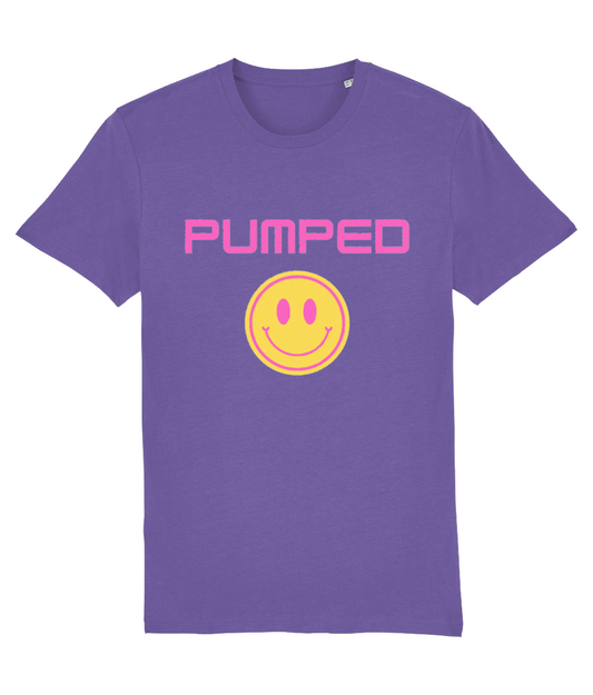 Pumped T-Shirt (Pink Text and Smiley) - Blue/Purple/ Ecru/Black